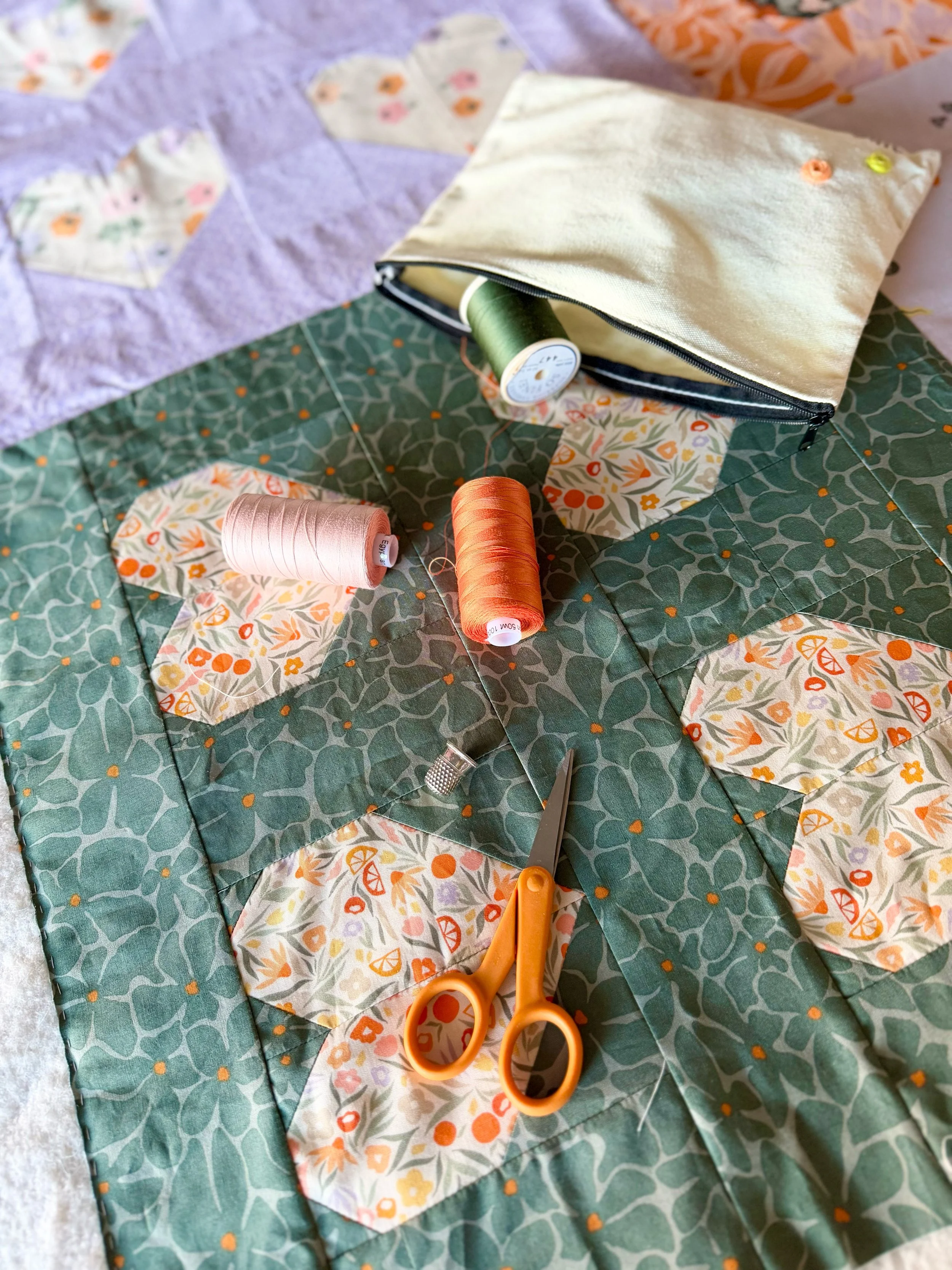 I’ve been wanting to do something with Art Gallery’s Tangerine line and this seemed like a great opportunity to use it! We were also going out of town and I wanted something to do as a passenger princess while we drove for hours. So I added a little bit of hand quilting to the hearts.